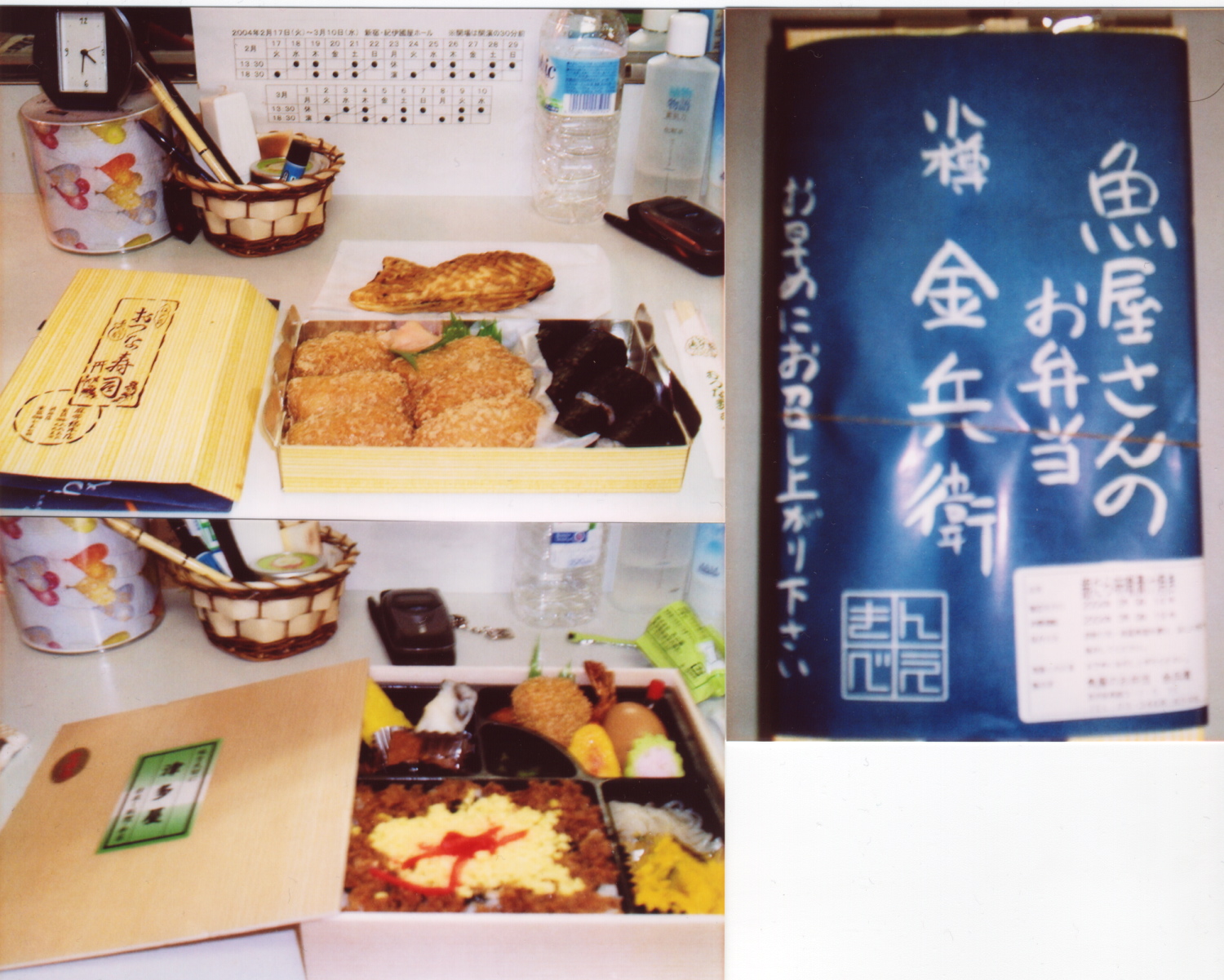 んなわけでその中のいくつかをご紹介。ほんとは他にも色々あったんだけど、バカなんで撮る前に食べちゃったのさ。でまぁ食べる前に撮れば撮ったで、「なんだ?そんなに嬉しいのか?」とみんなに突っ込まれるし。正直に言います。「嬉しいんです!」ゲッ!でもこの写真、美味しさ伝わるか!?伝わんねぇー、やべぇー、美味しさ伝わんないんじゃこのコーナーの意味ねぇー!どうするよ!急きょお弁当の思い出でも語ってみっか。人生で一番驚いた弁当は中3の時の木村君の弁当です。弁当箱あけたら白飯、おかずのとこにはホテイの焼き鳥の缶詰めが缶のまんま入ってたからな。そりゃお前、親父の酒のつまみだろっ!弁当を包んでた新聞を読みながら缶詰め食ってる木村君に突っ込んどきました。