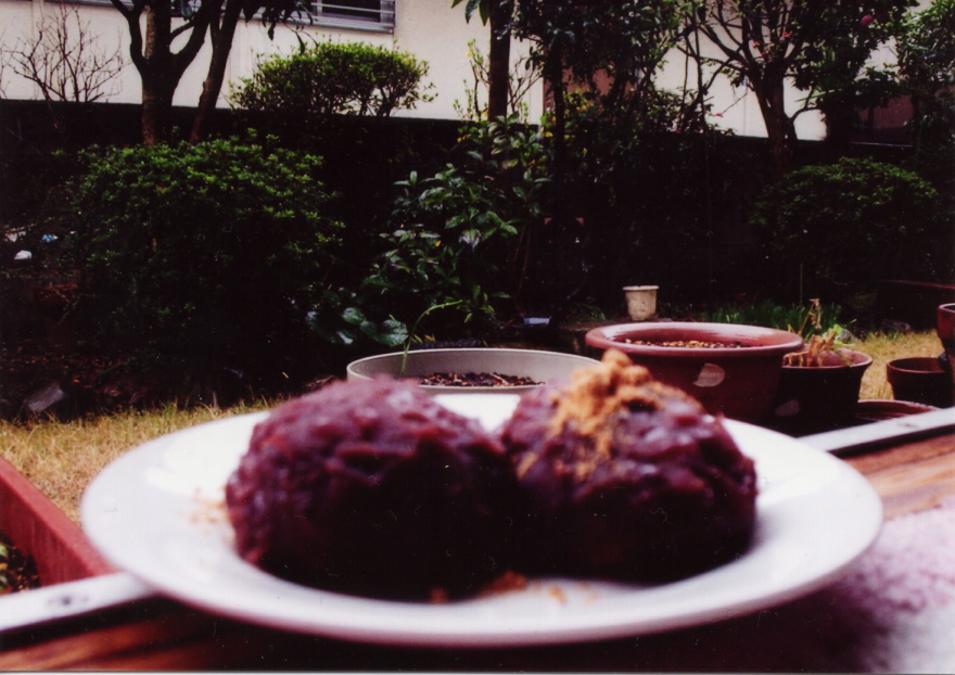 初雪!たぶん。この日我が家は雪でした。我が家ってのは埼玉の実家。前日僕は山のような洗濯物を抱え、ひねった足を引きずって、実家に帰ってきたのです。で翌朝、起きたらば雪、でもってお彼岸ってことで食卓にはおはぎ。初雪だしこりゃ写真写真と撮ってみたのですが雪は何処へやら、写ってませんが確かに降ってたのです。寒い一日でした。