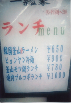 商店街から狭い路地に入ったところにある小ぢんまりとしたお店でして、正直その小ぢんまり具合にも尻込みしていたというか、入ったら常連さんばかりいるような独特な雰囲気もあってためらってたんですが、今や商店街から路地に入る角にもランチの看板が出ていて、値段も書いてあるし、恐いものなしです。メニューは韓国釜山ラーメン、ピョンヤン冷麺、釜山モツ鍋ランチ、焼肉プルコギランチ。ここはどうせだしプルコギランチにしようかと思いつつ、でも冷麺も捨て難いなぁなんて思いながら、いざお店へ、ガラガラと戸を開けると、あら?目の前の席で春先にお世話になった近所の書店の店長がランチを食べてるじゃありませんか。あらお久し振りですと挨拶なんぞして、いざ注文。店長とお店の人は知り合いらしく、で僕が店長と知り合いってことで、お店の人もお勧めを気軽に話してくれたので、じゃぁせっかくだからと、韓国釜山ラーメンを注文したのでした。