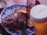 カサゴの唐揚げにビール、美味しそうですね。カサゴはエラを取り除き(取らないと生臭い)、わたを取り出して水洗いしたら、背骨にそって切り込みを入れ、片栗粉をまぶしてたっぷりの油で二度揚げして出来上がり!揚げ物とビール相性ときたら言うことなし、文句のつけようがありません。