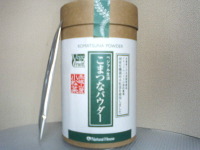 写真=こまつなパウダー(ナチュラルハウス 3,990円)、立て掛けてあるのが1包3g(小松菜半束!?)